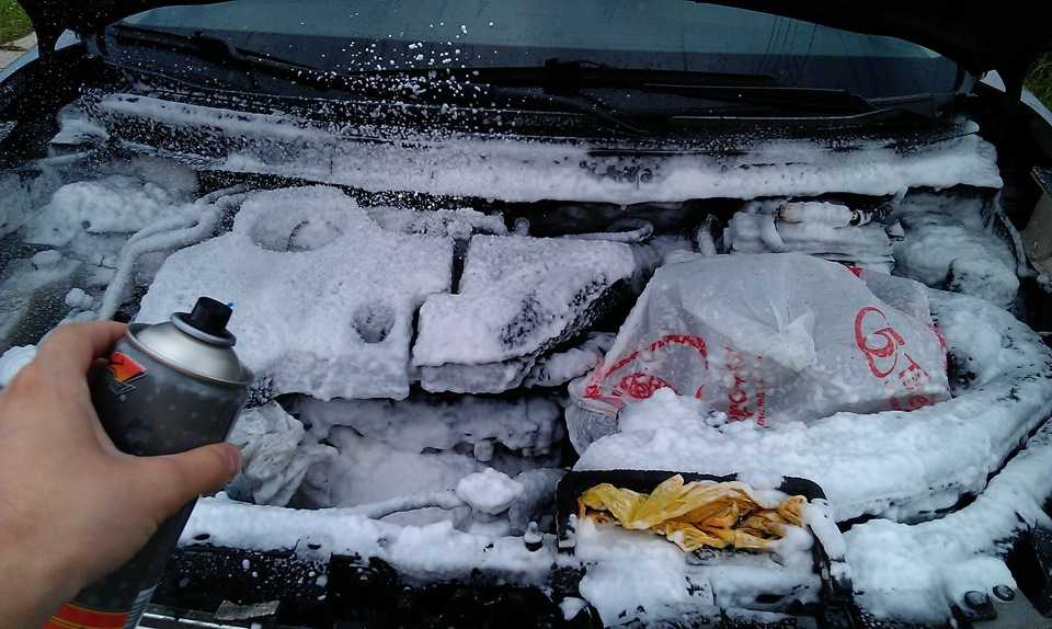 Если применяется сухая чистка аэрозолями – предварительно силовую установку машины нужно прогреть до теплого состояния. Нанесение таких средств на холодный ДВС не принесет нужного результата. Во всех остальных случаях мотор перед началом мойки должен быть остывшим. Иначе струя холодной воды приведет к его резкому остыванию и возникновения риска деформации головки цилиндров.
