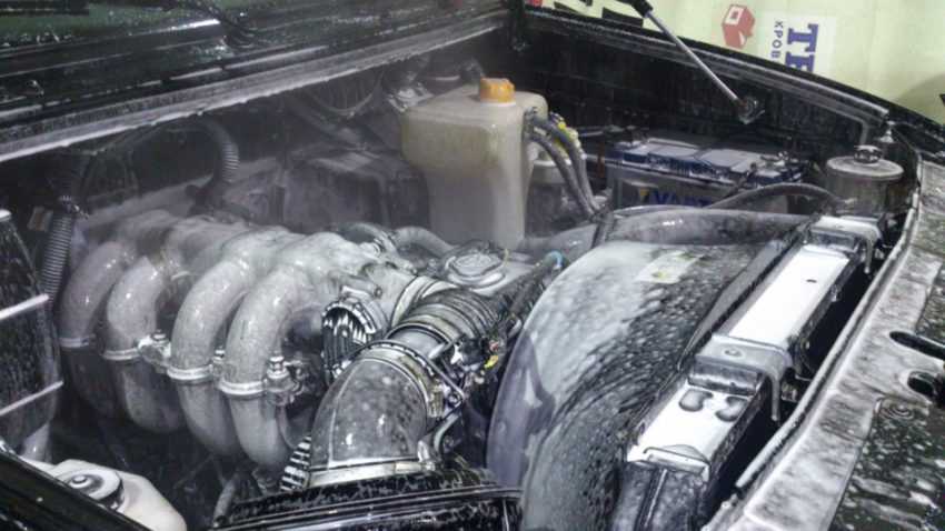 Кистью или распылителем на поверхность ДВС наносят чистящий состав. Выждав некоторое время, его смывают с помощью мини-автомойки. Напор воды должен быть минимальным – сильная струя способна нарушить работу двигателя.