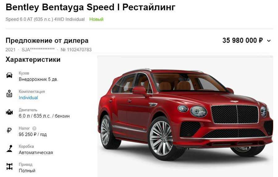 Лидером в представленной «троице» самых дорогих машин является Bentley Bentayga Speed I Рестайлинг. За 35,9 млн рублей можно получить 5-дверный внедорожник в индивидуальной комплектации 2021 года выпуска.
