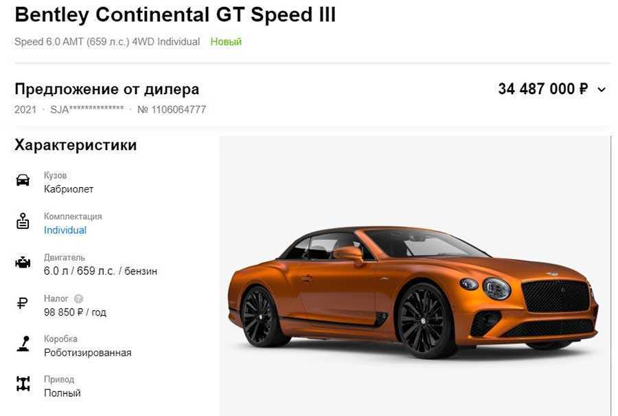 Покупка Bentley Continental GT Speed III обойдется в 34,5 млн рублей. За эти деньги предлагается купе 2022 года выпуска в индивидуальной комплектации с 6-литровым двигателем мощностью 659 лошадиных сил.