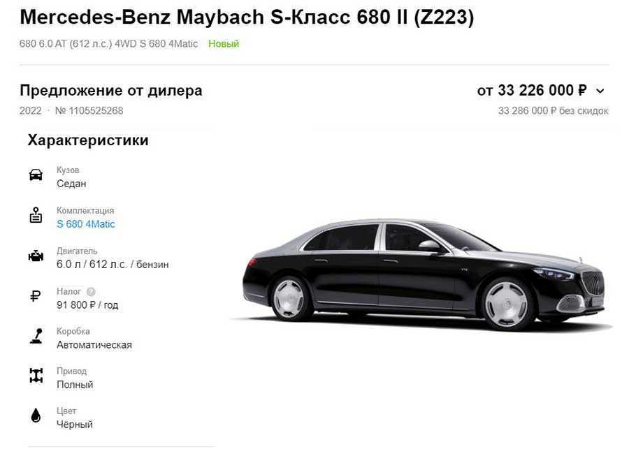 Одна из самых дорогих машин. В продаже доступен Mercedes-Benz Maybach S-Класс 680 II (Z223) с 6-литровым двигателем мощностью 612 лошадиных сил. Комплектуется автоматической коробкой перед, имеет полный привод и выполнен в черном цвете.