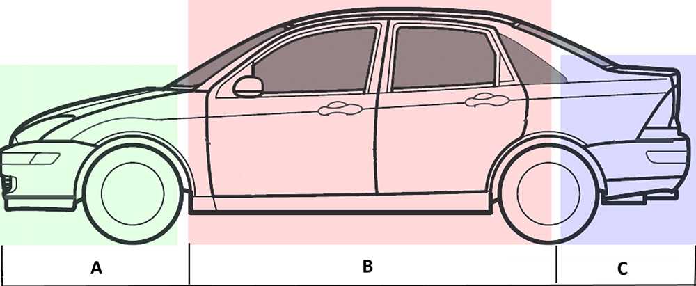 A — моторный отсек; B — пассажирский салон; C — багажник