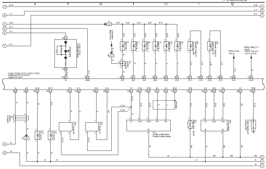 Схема топливных форсунок, лампы чек енджин, датчиков положения коленвала и распредвала, клапанов ввт, расходомера воздуха, электронной дроссельной заслонки, датчика температуры охлаждающей жидкости.
