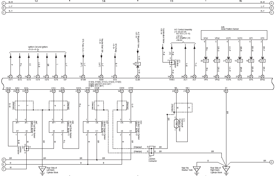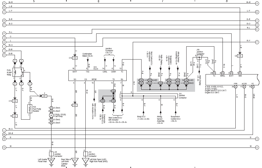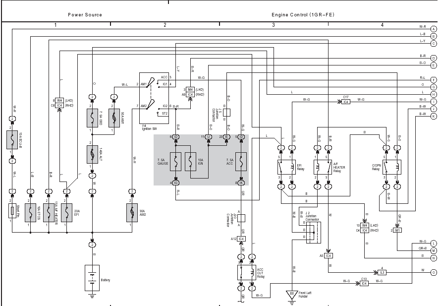 Схема EFI relay, A/F Heater relay, C/OPN Relay, ACC CUT Relay (отключает цепь аксессуаров во время вращения стартера, управляется от блока управления двигателя)
