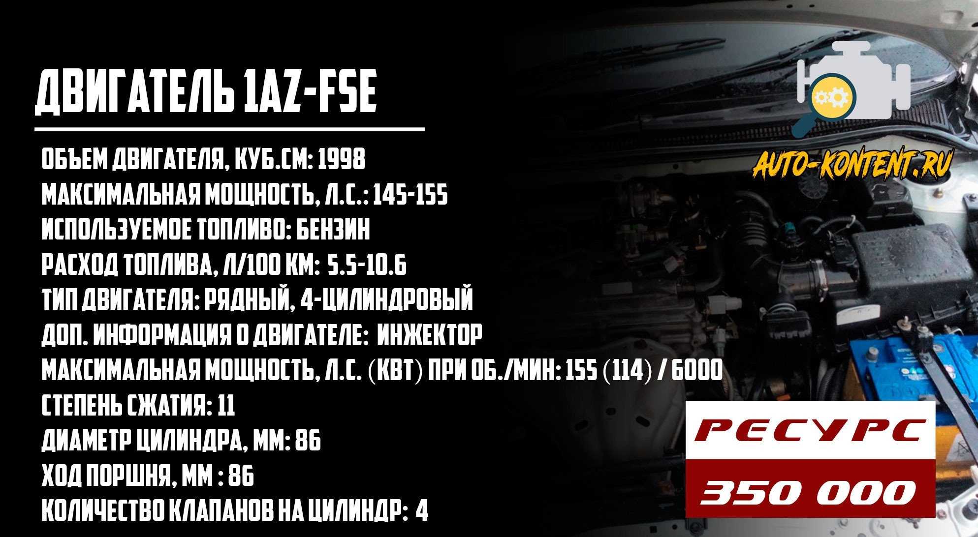 Мощность зависит от прошивки электронного блока управления и может достигать 150-155 лошадиных сил. Крутящий момент составляет 190-200 Нм. Двигатель 1AZ-FE отличается от старого не только фирменной системой непосредственного впрыска топлива, но и облегченными поршнями и жидкостным масляным радиатором. С глобальной точки зрения, это классический силовой агрегат семейства 1AZ. Он имеет алюминиевый блок цилиндров с чугунными втулками и алюминиевую головку. В головке блока цилиндров установлены два распределительных вала DOHC, без гидрокомпенсаторов. Привод ГРМ представляет собой однорядную цепь ГРМ с системой переменной фазы газораспределения VVT-i, установленной на стороне впуска.