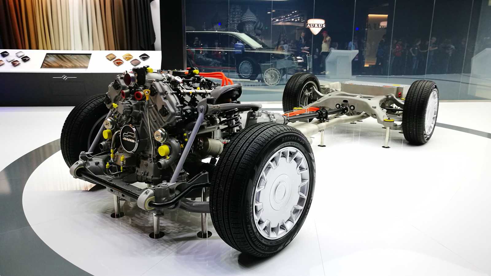 Начнем с двигателя. Итак, под капотом здесь установлен турбированный 4.4 литровый 600-сильный мотор V8 (в паре с небольшим электрическим двигателем, который выступает в роли помощника – к примеру, трогается машина именно на электрическом ходу). Да, в его разработке принимала участие компания Porsche, за одним маленьким нюансом – техническое задание было полностью составлено специалистами НАМИ. То есть именно российские спецы задавали все параметры мотора, исходя из потребностей проекта. Это касается и тягово-динамических показателей, и габаритных, чтобы он идеально вписывался в компоновку автомобиля. Да и в целом «ауросовский» двигатель не имеет ничего общего с моторами Porsche. Вот вам немного цифр — диаметр цилиндра 88 миллиметров, а рабочий объем — 547,4 см³. У немецкого концерна просто нет мотора с такими характеристиками (во всяком случае серийного). Между тем российский двигатель получился довольно современным, к примеру, на цилиндр здесь приходится по четыре клапана, а степень сжатия 9.5:1.