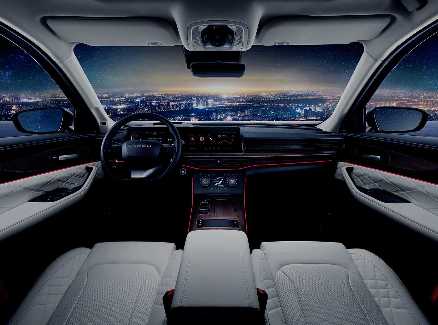 На Exeed VX используется панорамная крыша из ударопрочного стекла с теплозащитной пленкой. Предусмотрено кнопочное и голосовое управление люком, а датчик дождя автоматически закрывает панель, защищая салон от воздействия влаги. Средний ряд кресел Exeed VX оснащен механизмом для регулировки по расстоянию до передних сидений, имеется привод для плавной корректировки угла наклона спинки. Передние сиденья оснащены электрическими приводами для настройки положения с памятью.