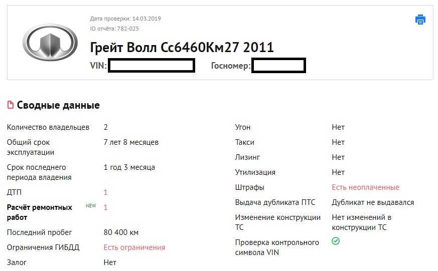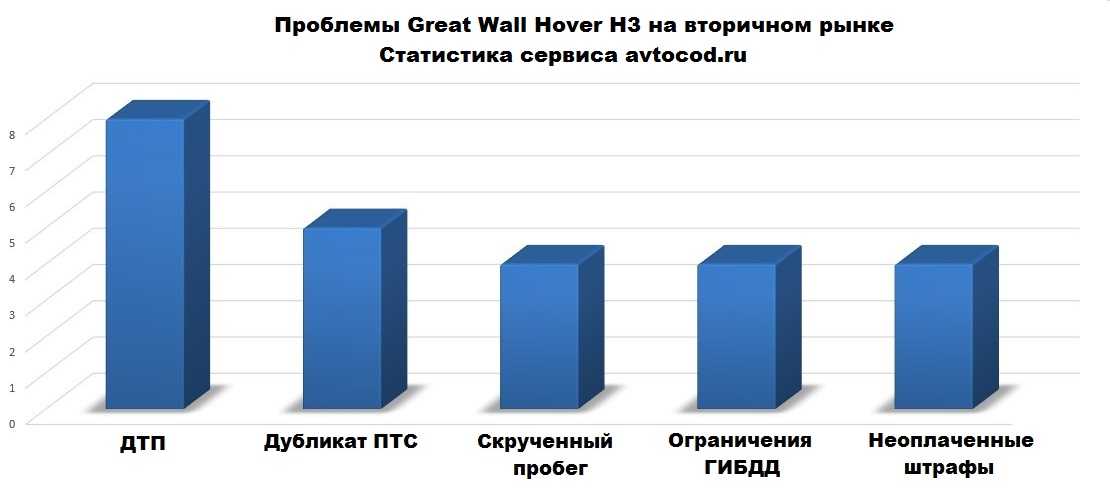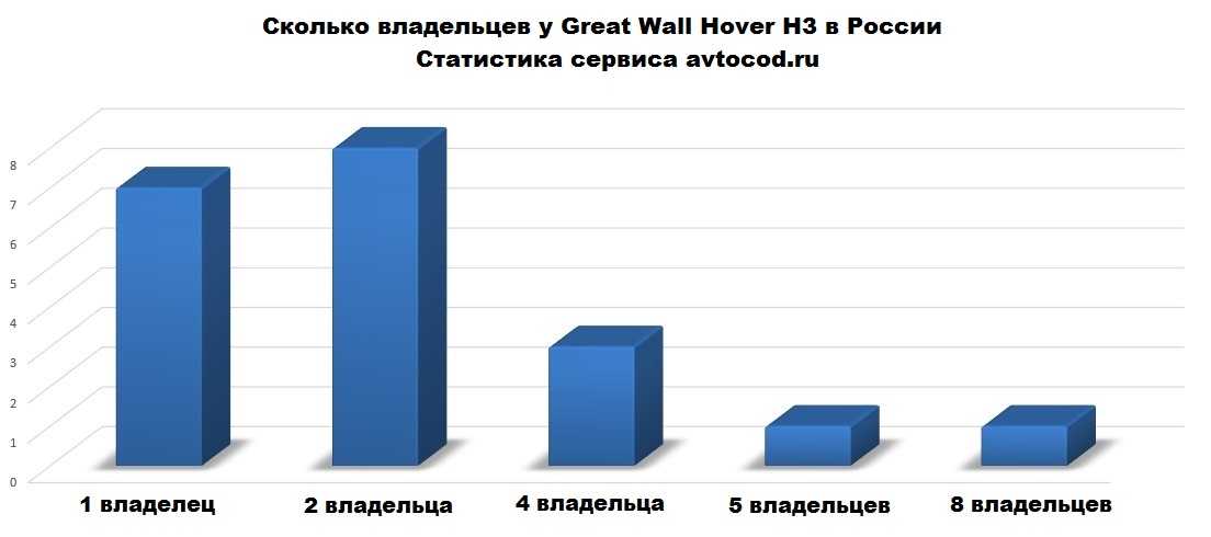 Мы случайным образом выбрали 20 отчетов из базы данных и обнаружили, что большинство автомобилей было продано после одного или двух владельцев. 7 из 20 ховеров принадлежали одному владельцу, а 8 из 20 — двум. Реже — 3 из 20 — продавались после трех владельцев. Были и экземпляры в продаже после 8 владельцев.