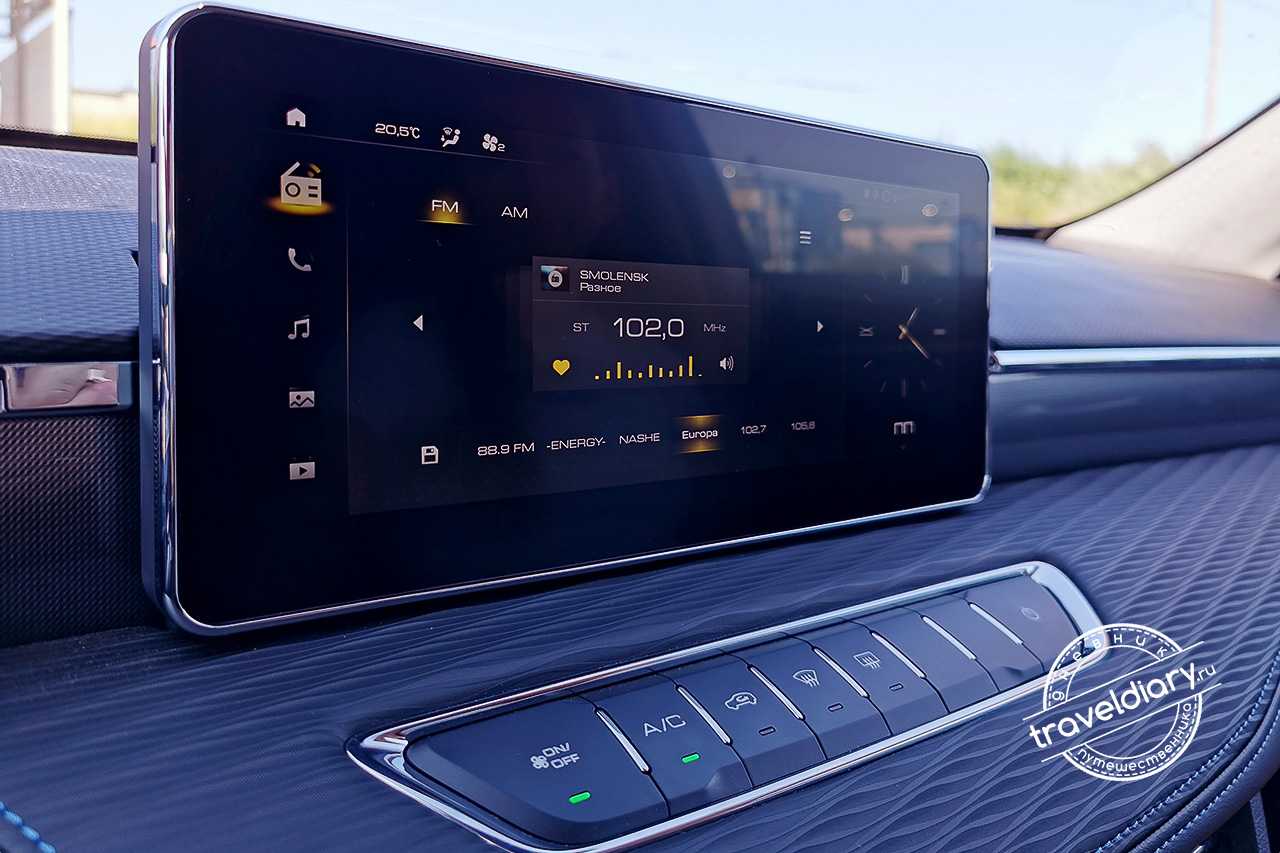 Мультимедиа система быстро включается, не тормозит, не зависает, на удивление для китайцев грамотно переведена на русский язык. Управление понятно и логично. Придраться можно лишь к паре-тройке слишком маленьких пиктограмм и иногда чрезмерным сокращениям… На крыше автомобиля всего лишь небольшой «плавник» антенны, но ловит сигнал радиостанций безупречно — ни помех, ни шумов, ни сбоев!
