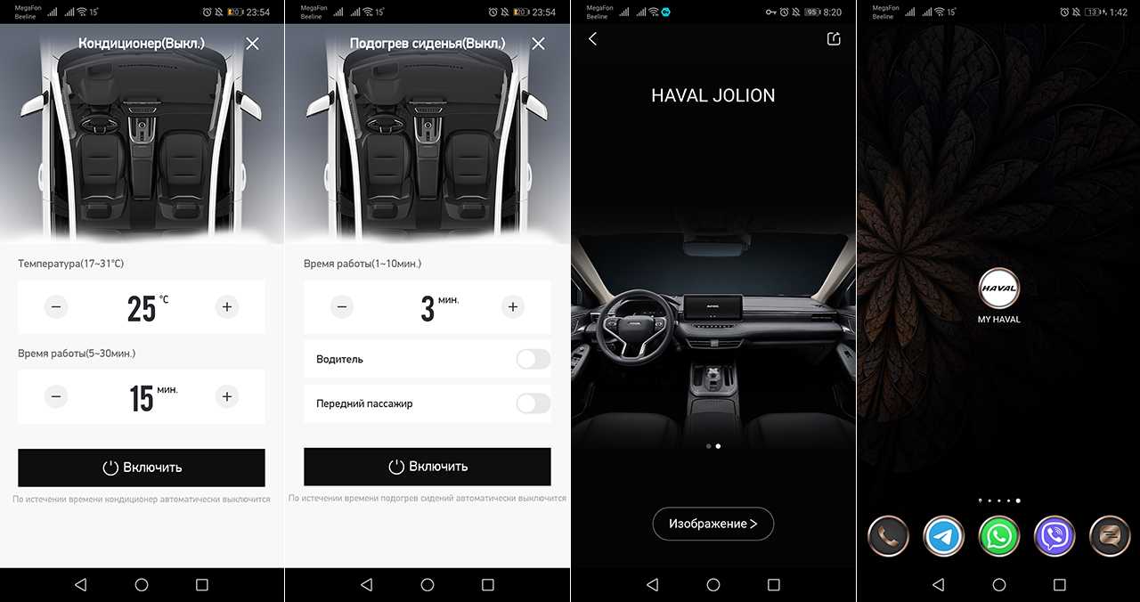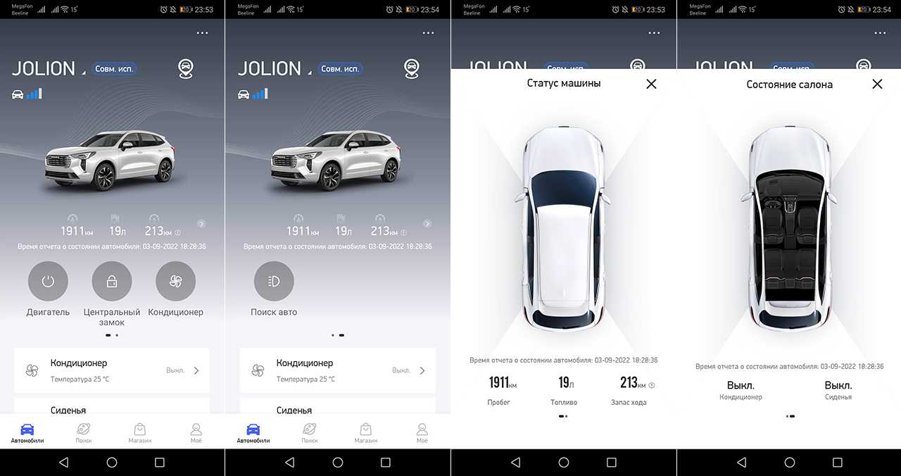 Через мобильное приложение MyHaval с экрана смартфона Вы сможете увидеть пробег, остаток топлива и запас хода, найти автомобиль на карте или мигнув фарами, открыть/закрыть двери, завести/заглушить двигатель, включить/выключить кондиционер и подогрев сидений.