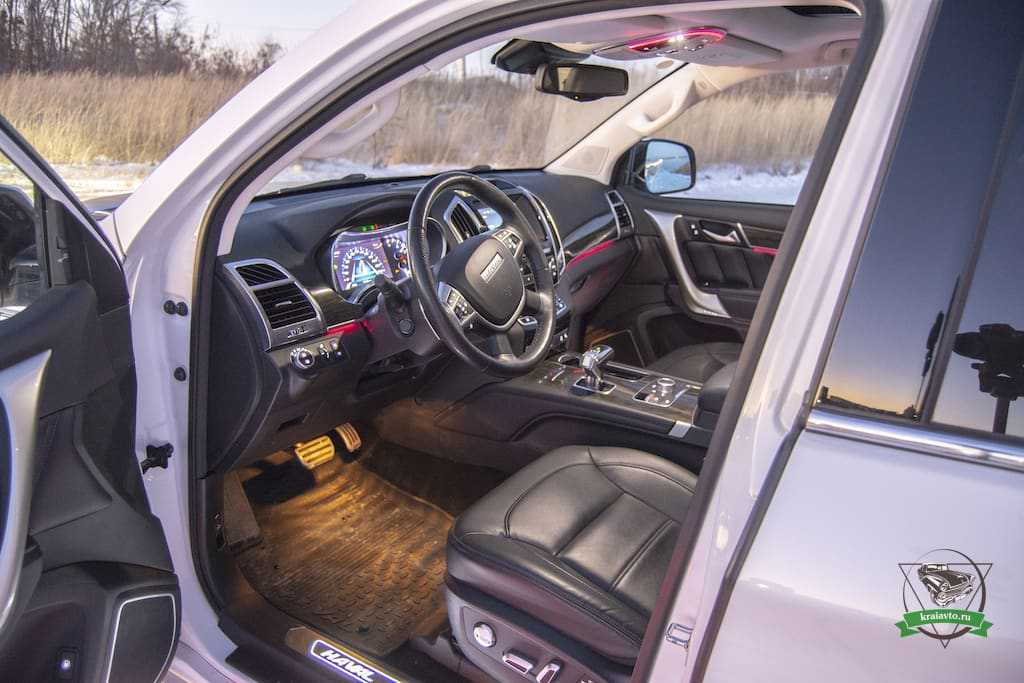 Салон Haval H9 смотрится богато: кожа высокого качества (мягкая, прочная), податливый пластик, вставки «под дерево», алюминий, хромированные элементы – все детали интерьера составляют единую дизайнерскую композицию, обеспечивают уют и комфорт внутри Haval H9. Предусмотрена атмосферная подсветка салона (цвет можно менять).