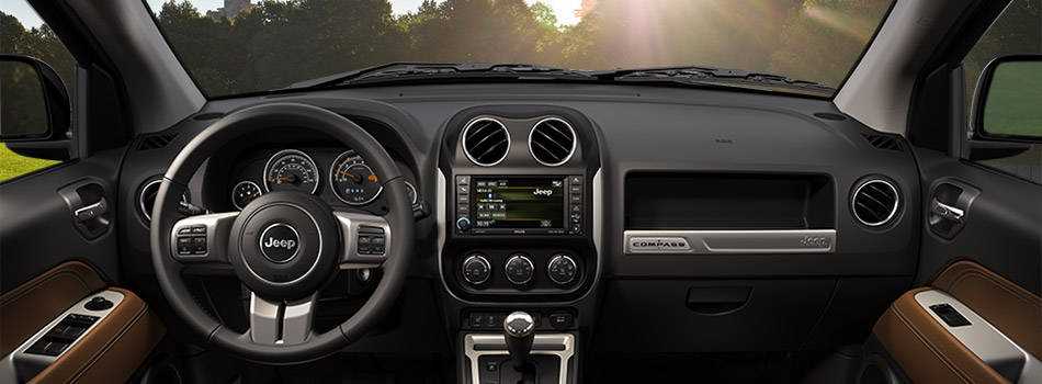 Салон Джип Компас отделан качественными материалами, но лишен каких-либо необычных вариантов отделки либо нестандартных решений в компоновке доступных приборов. Центральная консоль представлена небольшим дисплеем мультимедиа, под которым расположены физические органы управления системой климат-контроля и прочими возможностями авто.
