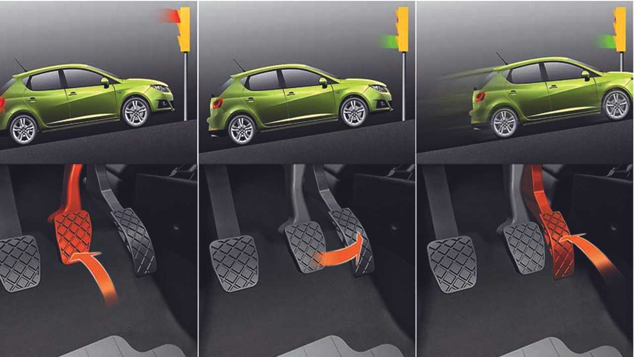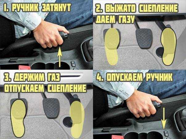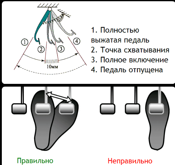 Запомним длину хода и силу пружины, которой оснащен возвратный механизм. После этого вновь выжмем педаль, включив первую передачу, и начнем двигаться. Начав движение, тут же отключим сцепление и плавно затормозим. Спустя некоторое время, потраченное на такую тренировку, вы запомните, при каком положении педали сцепления авто начинает движение. Отметьте сразу для себя, способен ли автомобиль начать движение на холостых оборотах или требуется «подгазовка» во время схватывания сцепления.