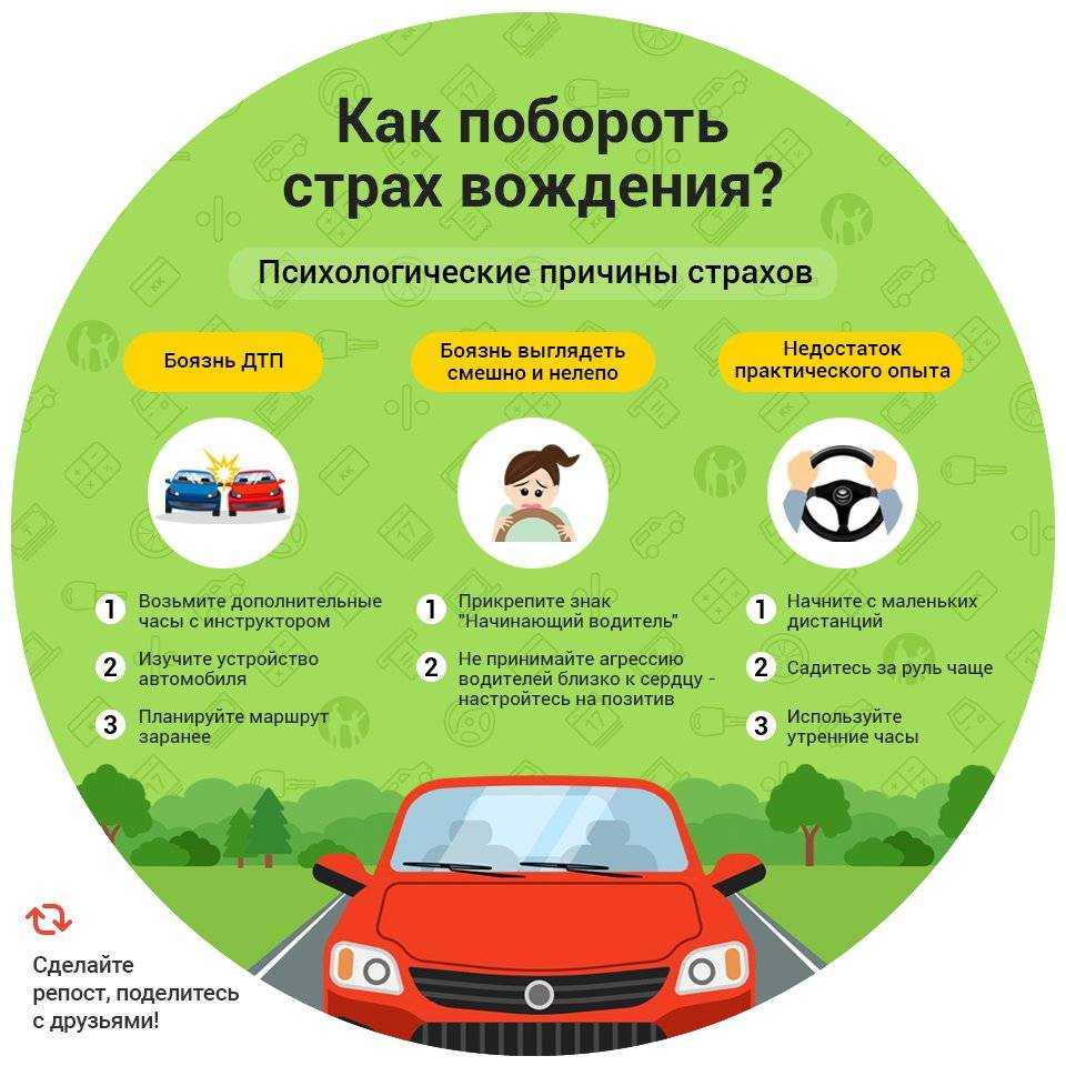 Психологи, как и инструкторы, для большей уверенности за рулем советуют не суетиться и не торопиться. Причины страха у всех могут быть свои. Кто-то больше всего боится заглохнуть посреди дороги, другие — сбить пешехода, третьи — повредить машину