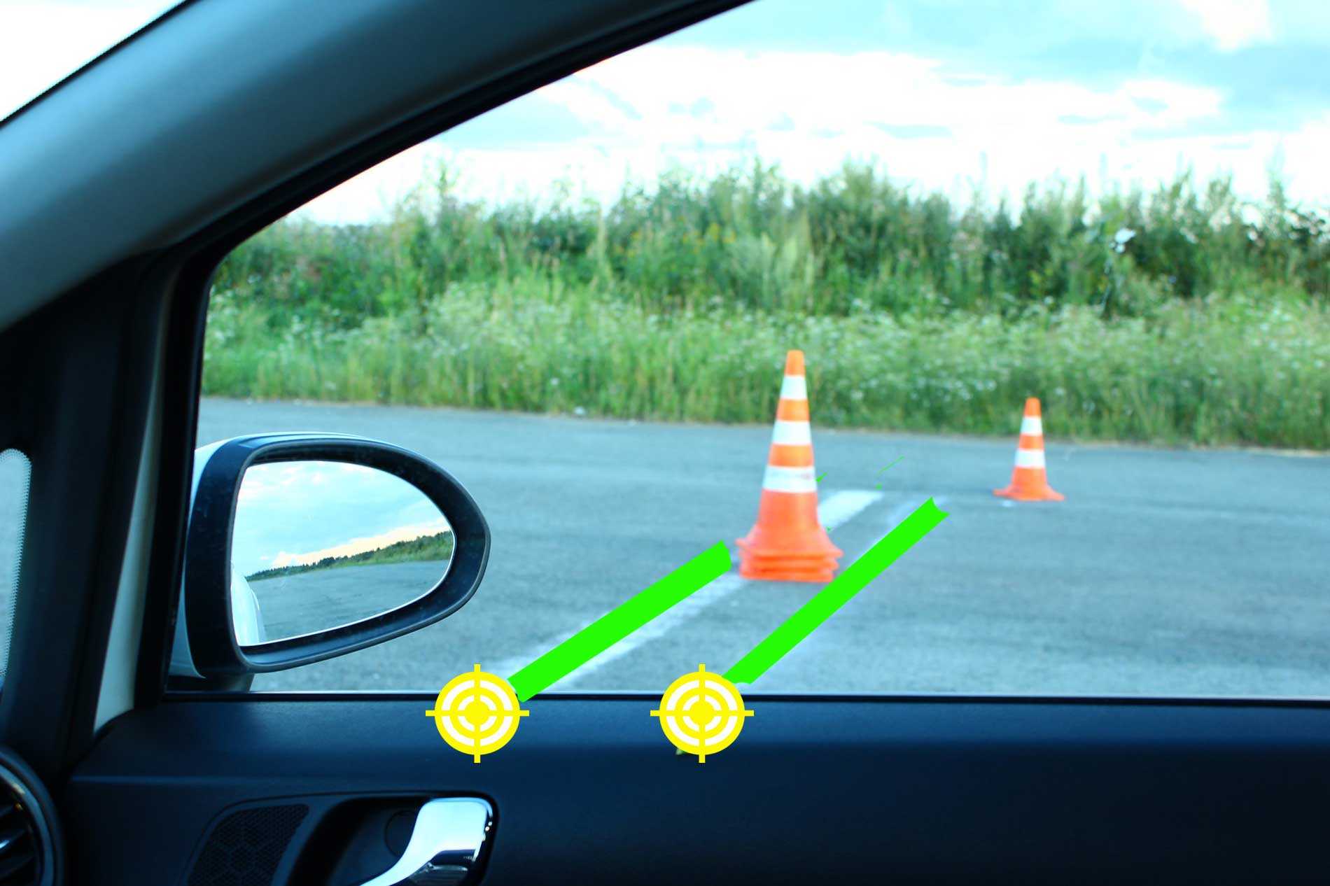 Поставим авто на площадку и прочертим с помощью мела две прямые длиной 5-6 м, берущие начало от передних колес. Сев на водительское кресло возьмем за ориентир щетку дворника или выступ на панели (можно и что-нибудь другое), визуально«свяжем» его с позицией правого колеса. Проделаем такую же манипуляцию для левого колеса. Мелом проведем линии так,чтобы они находились на уровне зеркал заднего вида, которые выполняют роль крайних габаритных точек.Потренировавшись с помощью этого метода, вы обретете способность точно определять место расположения правой и левой колеи.