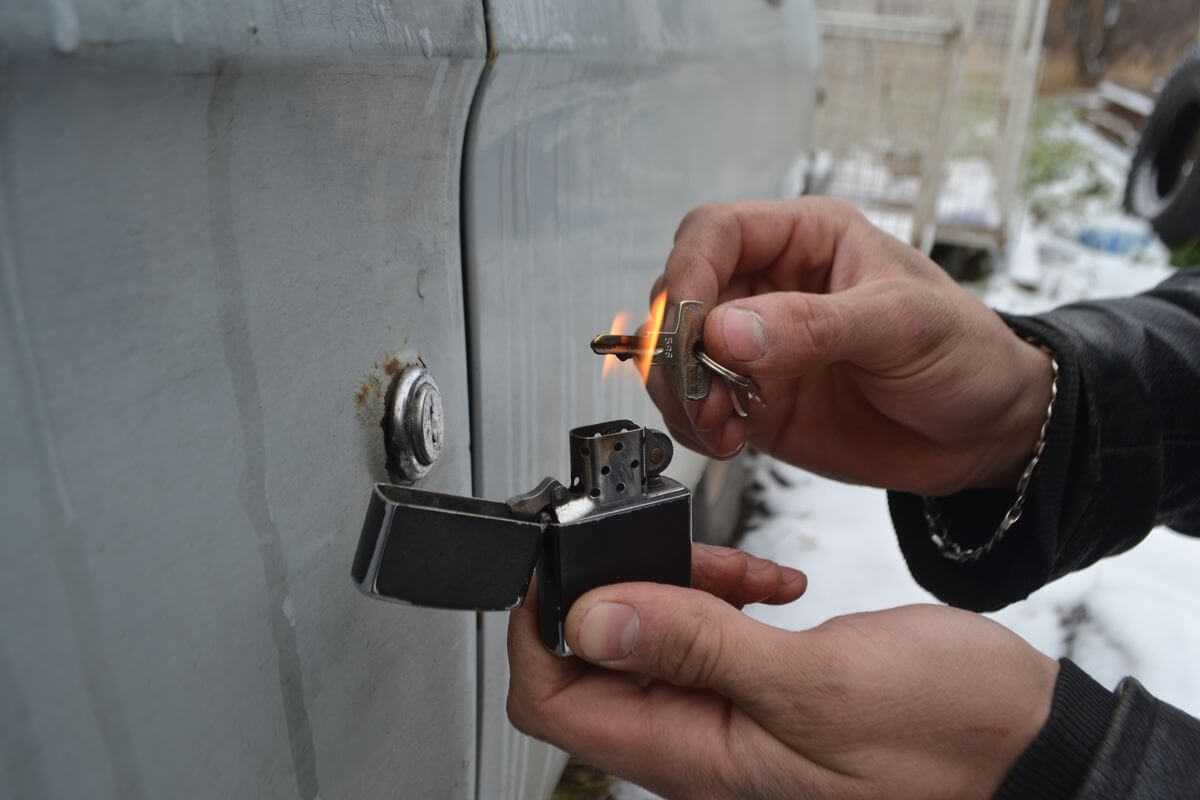 Чтобы разогреть запорный механизм автомобиля, иногда используют автогенную зажигалку. Ее нельзя держать слишком долго, к тому же она может повредить краску.