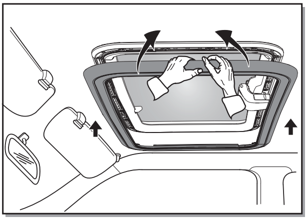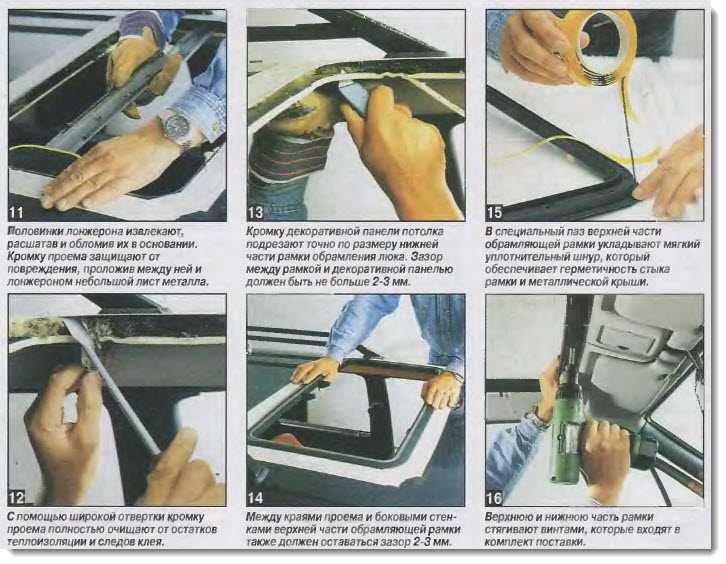 - В салоне автомобиля подрежьте по месту край обшивки потолка так, чтобы она заправилась за нижнюю раму люка и не мешала установке облицовочного обода.