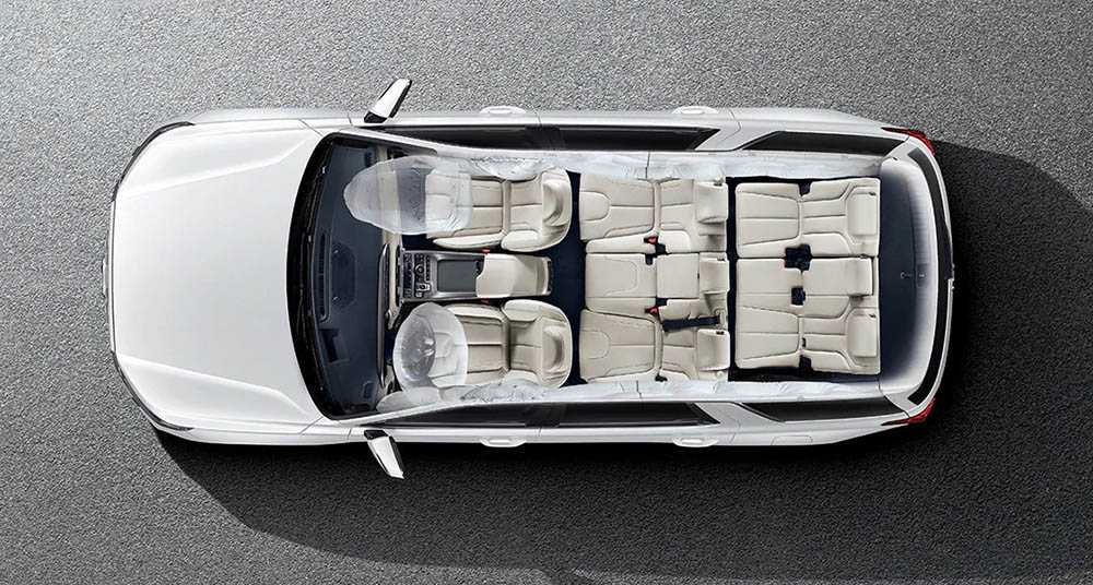 7-местного внедорожника соответствует его просторному салону: при сложенных сидениях третьего ряда объём багажника равен 1045 л, а если убрать и второй ряд, то грузовой отсек составит