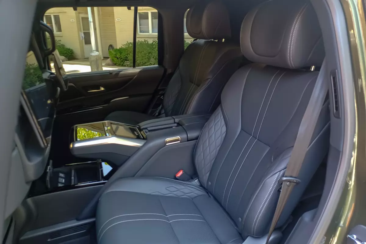 За исключением кресел класса «Ультра Люкс», в других отделках есть сиденья второго ряда с ремнями безопасности на троих, но пространство для среднего пассажира узкое. Разработчики Lexus рассматривают возможность добавления отдельных кресел в будущие отделки, но это кажется упущением для роскошного флагманского автомобиля. Сиденья обогреваются и вентилируются, а с помощью ручного рычага раздельные сиденья 60/40 поднимаются и опускаются вперед для доступа к третьему ряду.
