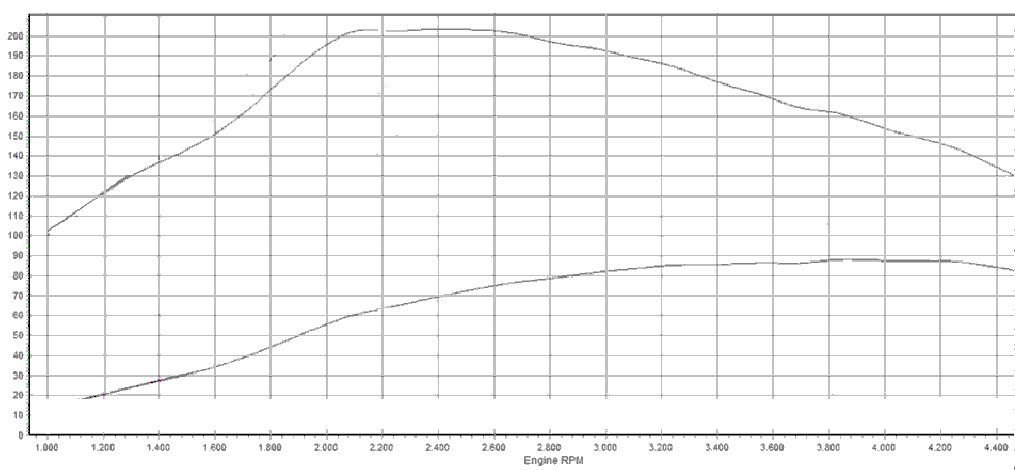 - Наибольшее тяговое усилие стало равным 204 Н*м. Может быть, стенд «врёт» (завышает значения). Будем считать, что цифры остались теми же – 200 Н*м.