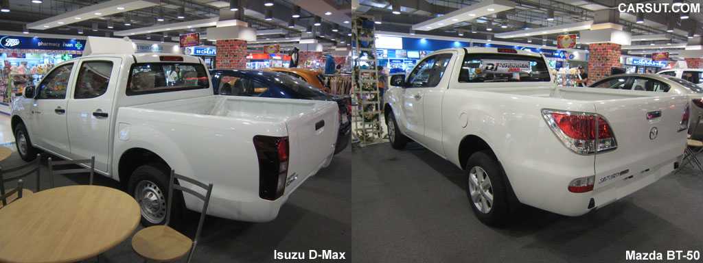 The D-Max has an overall width of 1800mm while the BT-50 is 1807mm, a difference of only 7mm. Compare both car heights, the BT-50 is slightly taller at 1762mm and the D-Max is 1735mm.