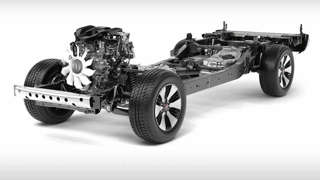 The suspension consists of an independent double-wishbone with coil spring struts up front, with a leaf-sprung live axle carrying the load at the rear. Cab chassis variants get heavy-duty rear leaf springs for additional load-carrying capacity. Braking is provided by 320mm ventilated disc brakes up front and 295mm drum brakes at the rear.