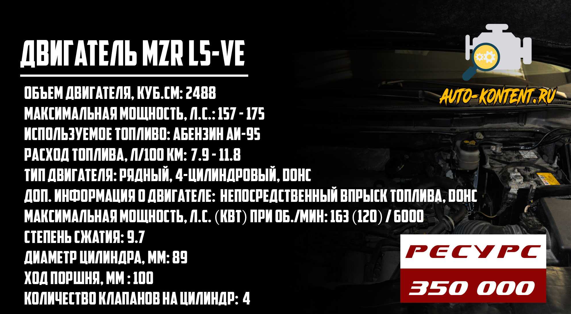То есть это полностью алюминиевый ДВС, изготовленный по современной технологии моторостроения. Поршень в этом двигателе ходит на 100 мм, а цилиндры расточены под 89 мм. Есть фазорегулятор, стоящий на впуске, гидравлические компенсаторы отсутствуют. Газораспределительный механизм с двумя валами DOHC, которые приводятся в действие посредством цепи ГРМ. Стоит отдать должное инженерам Мазда, они учли прошлые недочеты и выпустили на самом деле надежный и ресурсный бензиновый мотор. Он конструктивно простой, но при этом мощный, обладает неплохими показателями. У него практически нет слабостей и детских «болезней». Здесь практически не был отмечен масложор, единственное, на профильных сайтах и тематических форумах можно встретить сообщения от автовладельцев о том, что в MZR L5-VE появляются течи теплообменника и поломки навесного оборудования.