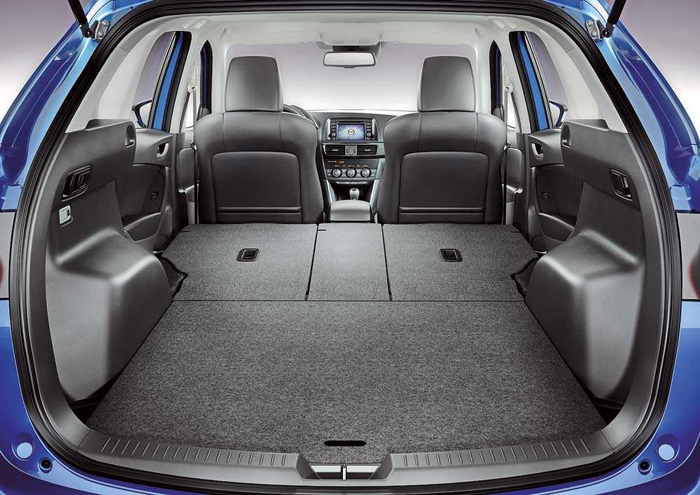 Размеры багажного отсека CX-7 дают возможность использовать его не только для обычных поездок, но и для грузоперевозок. В обычном состоянии объём багажника составляет 455 литров, а при складывании заднего ряда кресел – 719 литров. Сложить сиденья можно, всего лишь потянув расположенные по бокам багажного отделения рычаги.
