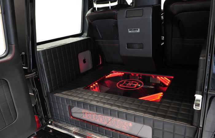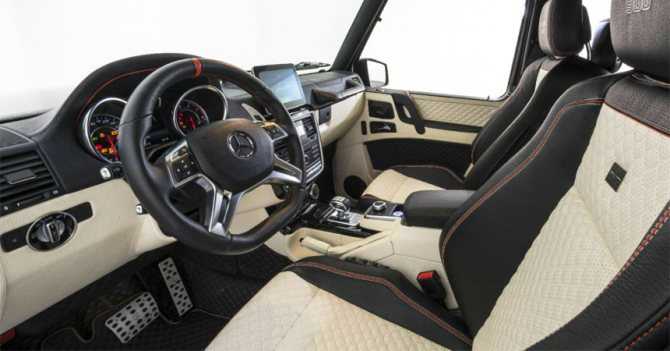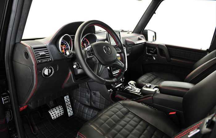Внутри интерьер Mercedes Brabus включает «Mondial Vanilla» и «Mondial Black», выделенные красным контуром и декоративной строчкой ванильного цвета. Кожа Mastik используется в центральных секциях сидений. Салон люксового внедорожника оснастили впечатляющим «звездным небом» Alcantara с сотнями оптических волокон, которые меняются синхронно с окружающим освещением всего интерьера