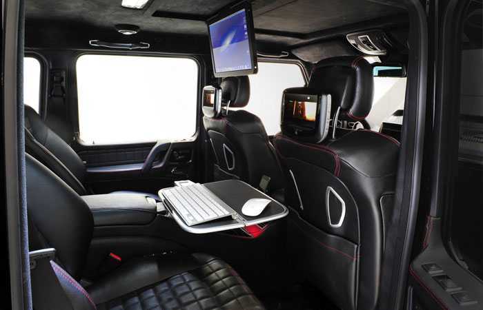 Претерпел существенные трансформации и салон Brabus G800 iBusiness. Вместо дивана для пассажиров в задней части салона установили кресла, а в центре салона – консоль с холодильником. Для отделки салона использовали алькантару и кожу высокого качества. Ярким штрихом салона новой версии авто стали металлические накладки на педалях водителя и оригинальная подсветка на порогах.