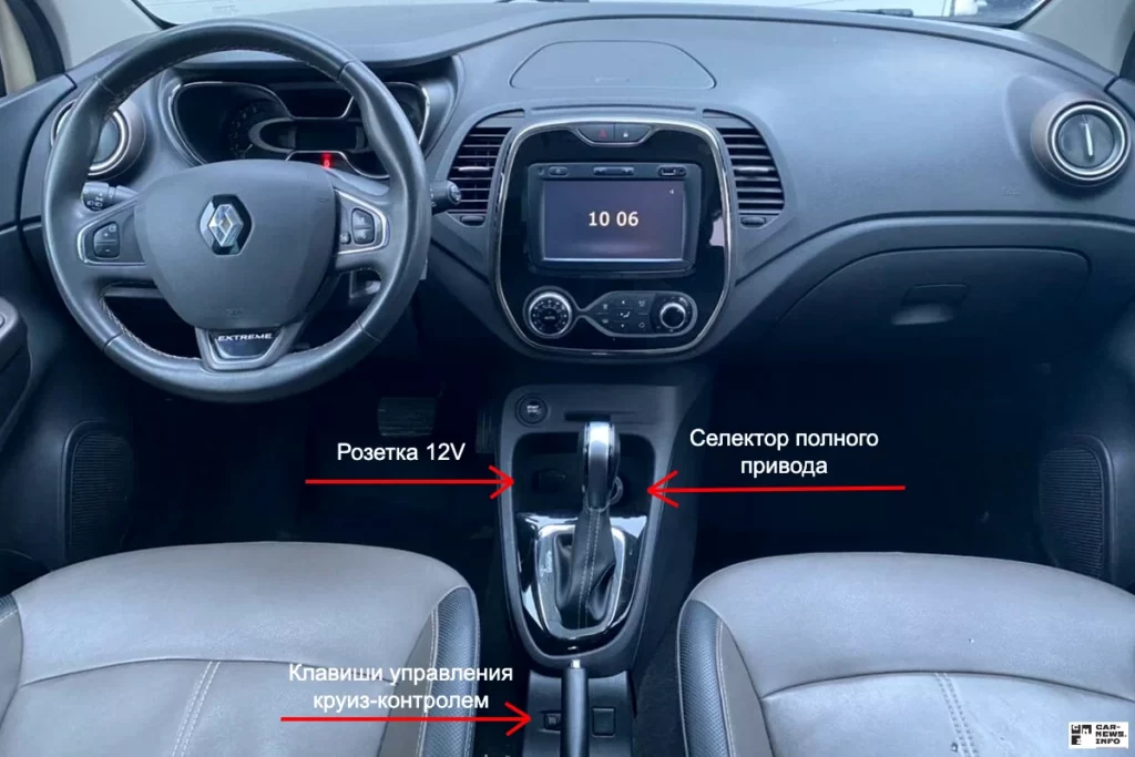 Минусов в интерьере Рено Каптур первого поколения немного, а эргономических ляпов достаточно много. Повсюду жесткий пластик, который немного оживлен вставками под рояльный лак. Естественно с течением времени чёрный глянец обрастает царапинами. Другие минусы можно отнести к эргономическим просчетам. Например шайба управления полным приводом и розетка 12 вольт неудачно спрятана за рычагом коробки передач. Также за рычагом КПП расположен единственный подстаканник. Поэтому любителям напитков стоит избегать резких торможений, а стаканы обязательно закрывать крышками. А вот кнопки круиз контроля спрятали вообще под ручник!