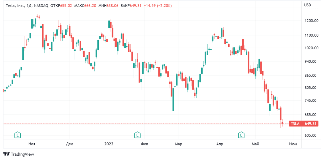 На 23 мая 2022 года акции продаются по цене около 650 долларов за штуку. Что делать с акциями Tesla: бежать покупать или ожидать дальнейшего падения?
