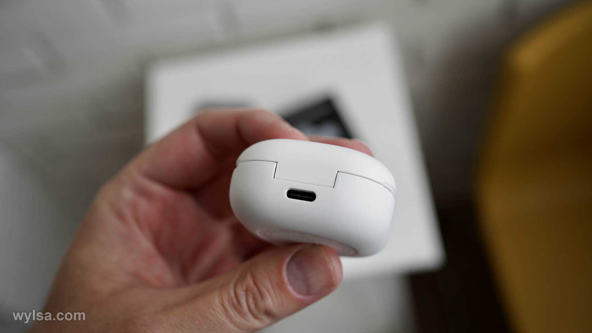 Пока модель выпускают только в трёх цветах: графитовом, лавандовом и белом. Белый мне лично нравится больше всего, не скучный. Футляр и чашечки матовые, для зарядки можно использовать беспроводную зарядку или любой кабель USB-C. Кейс маленький, легко помещается в любой карман.