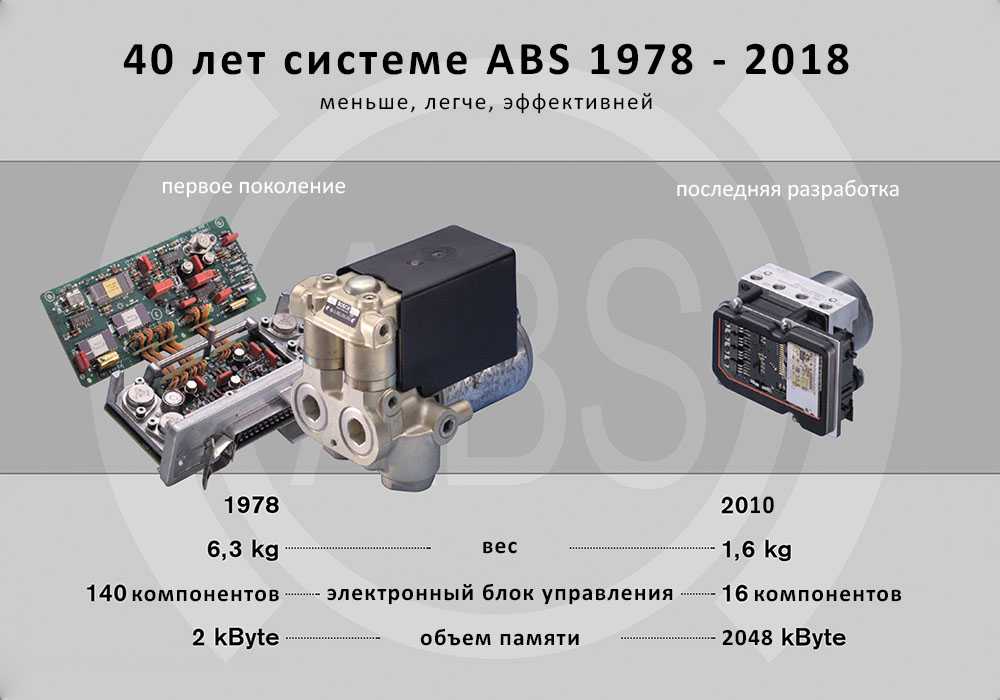 Впервые проблема блокировки колёс при торможении стала актуальной при эксплуатации железнодорожного транспорта. Заблокированные колёса поезда не только быстрее изнашивались, но и могли привезти к большой трагедии – сходу состава с рельсов. В 1936 году компания Bosch запатентовала технологию предотвращения блокировки колёс, но реализовать её было невозможно из-за малого развития электроники. Настоящий прогресс ждал эту область в 60-70-е годы прошлого века, когда появились полупроводниковые технологии. В итоге в 1970 году крупнейший немецкий автоконцерн Daimler-Benz презентовал первые модели безопасных АБС. Чуть позже через 8 лет появился первый автомобиль, укомплектованный системой ABS. Им стал Mercedes-Benz S-класса.