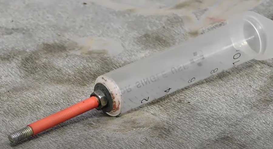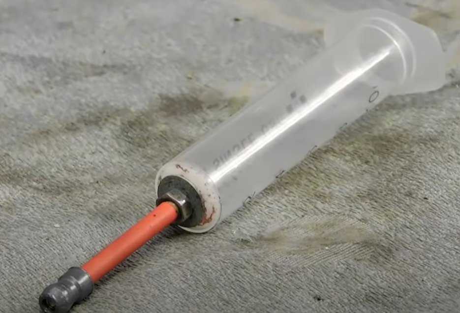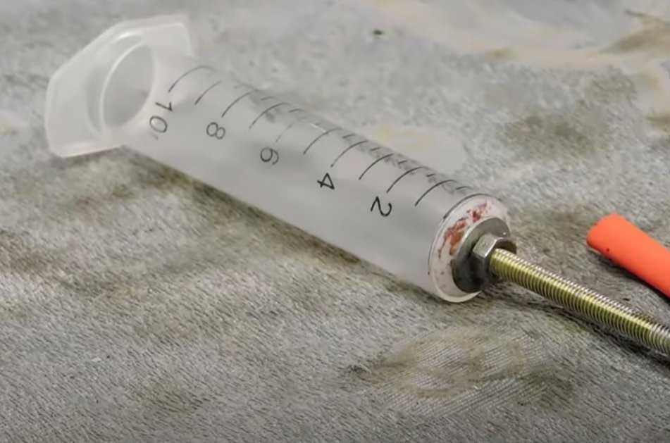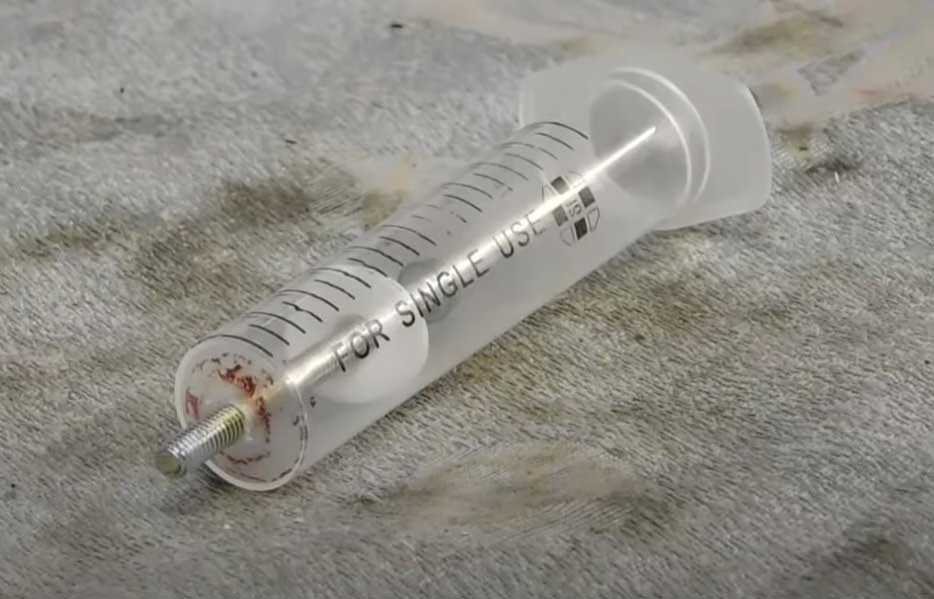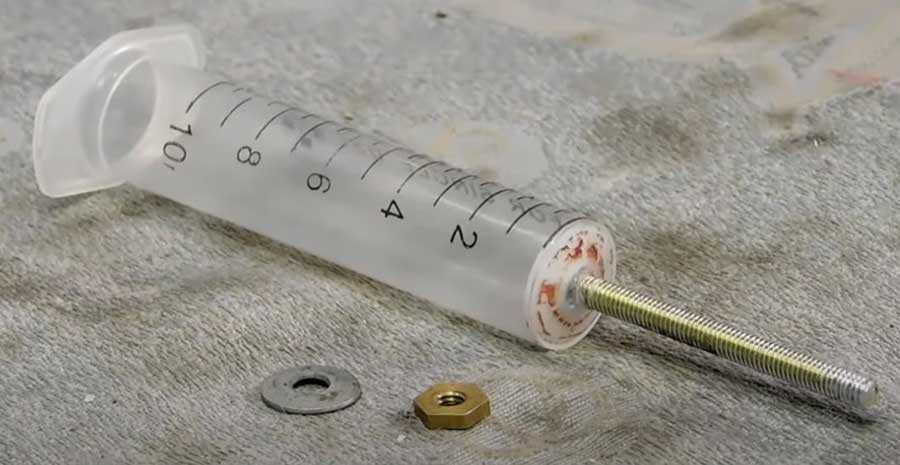 Срежьте носик и вытащив поршень вставьте в шприц винт на 4 мм. Также дополнительно можно поставить фторопластовую шайбу.