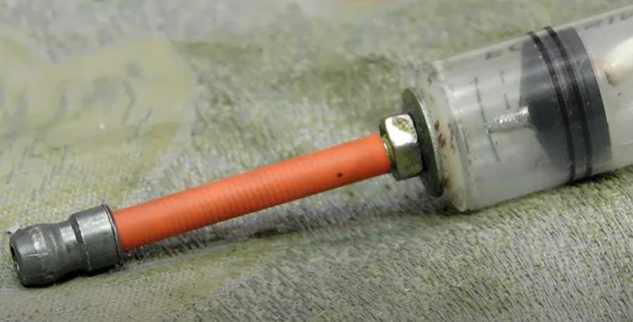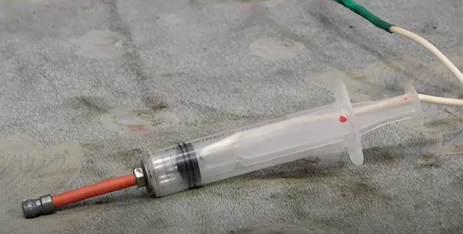 С помощью шприца и подручных материалов делаем тестер искры системы зажигания автомобиля с помощью которого можно проверить целостность свечного провода и модуль зажигания.