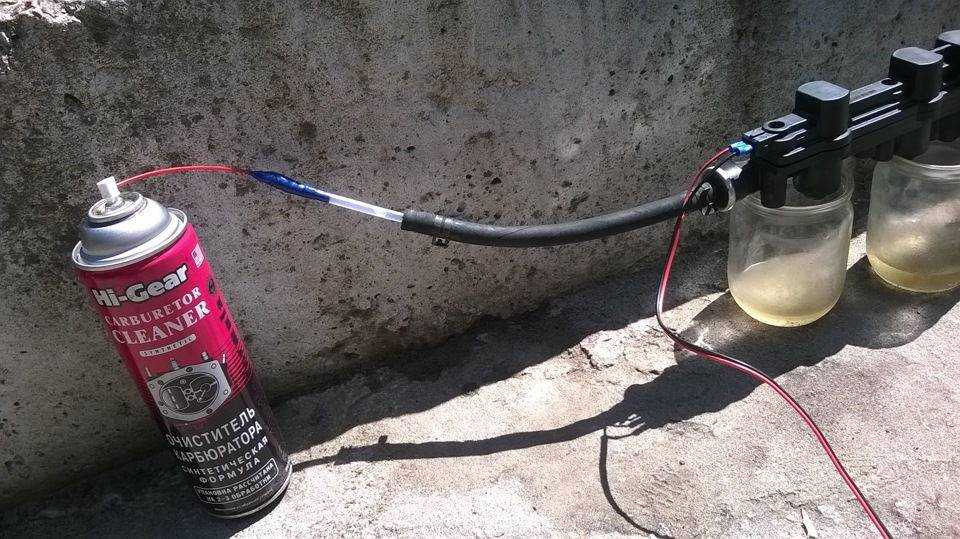 Вычистить форсунки не снимая можно. Для этого будет нужен промывочный цилиндр — изготавливается из двухлитровой пластиковой бутылки. На дне сверлится отверстие, к которому подключается компрессор. К горлышку крепится шланг, который подсоединяют к рампе. Действуем, не снимая двигателя.