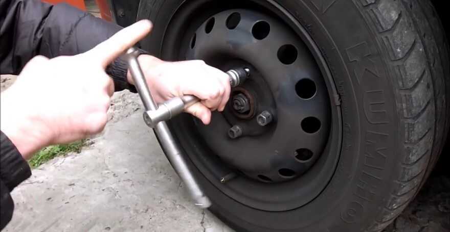 Болты на колесе, которое собираетесь снимать, нужно ослабить до того, как поднимать машину. Это позволит обойтись без помощника, который удерживает тормоза, пока вы орудуете баллонным ключом.