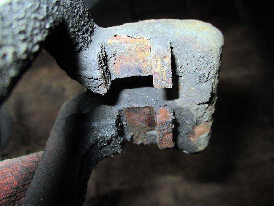Это вообще основная причина обращений с поводами «что-то посвистывает при езде» и «неравномерный износ колодок». Как известно, двигаться относительно скобы должен не только суппорт, но и колодки. Несмотря на это, многие не обращают внимания, тяжело ли ходят колодки в скобе, и едва ли не забивают их молотком при установке. Между тем, из фотографий ниже вполне понятно, из-за чего они заходят тяжело (рис. 2).