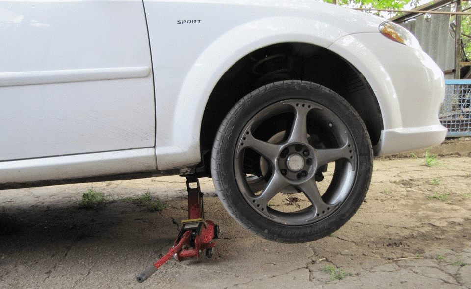 Когда вы поднимите колесо на домкрате, покачайте машину, чтобы убедиться в ее устойчивости. Если все в порядке, можно откручивать болты и снимать колесо.