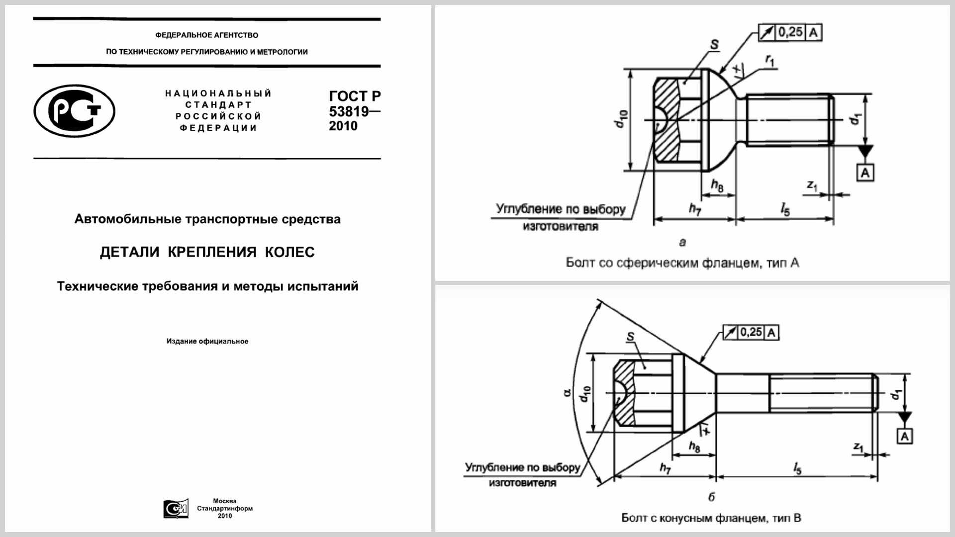 Прижимная часть болтика может быть и сферической, но обязана совпадать с профилями отверстий в колесном диске, чтобы обеспечить центровку колеса.