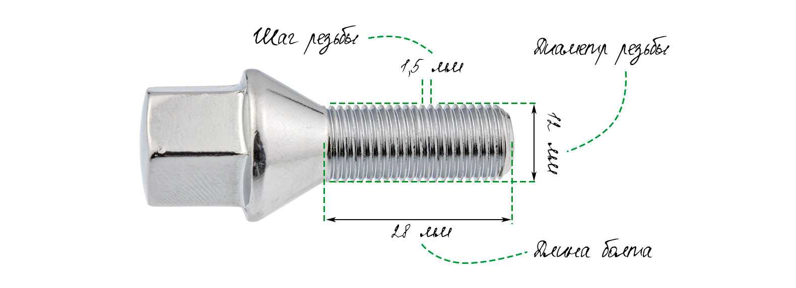 Чаще встречаются метизы с шагом резьбы 1,25 и 1,5 мм с диаметром 12 либо 14 мм. Рекомендуется приобретать новые колесные болты в комплекте с дисками либо учитывать требования инструкции производителя авто.