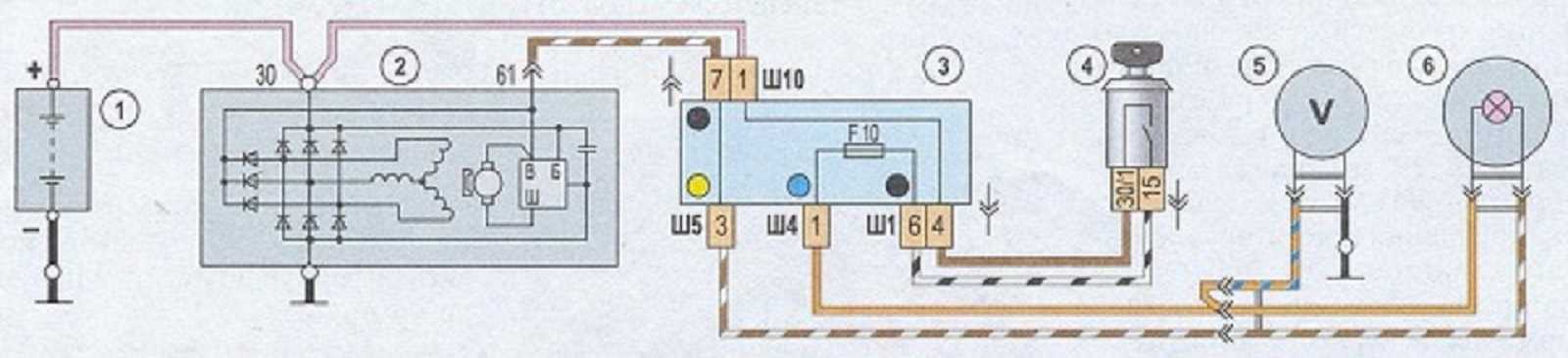 Генератор (поз. 2) подключается в схему последовательно между аккумулятором (поз. 1) и монтажным блоком (поз. 3)