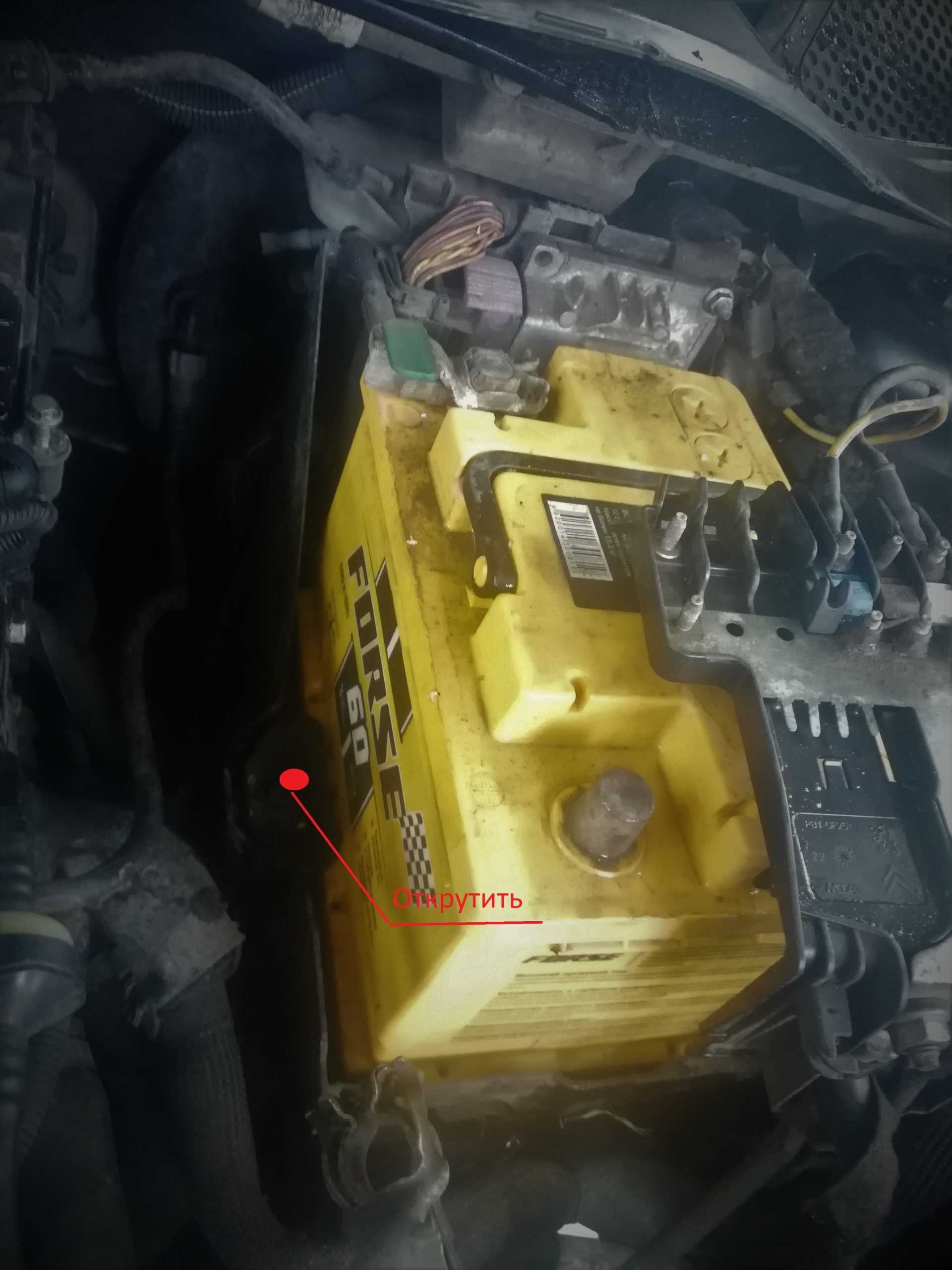 Снимаем пластиковый корпус АКБ, минусовую клемму и откручиваем крепление аккумулятора.