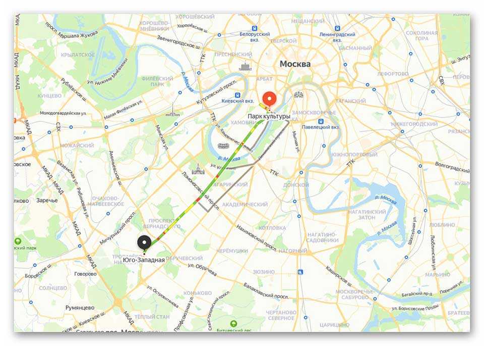 Теперь подведем небольшой математический подсчет. К примеру, нам нужно проехать по Москве от метро Юго-Западная до Парка Культуры в час-пик. Протяженность маршрута составляет 12 км, которые без пробок можно преодолеть всего за 16 минут. Из них мы встретим 19 светофоров и проторчим в пробке минимум час.