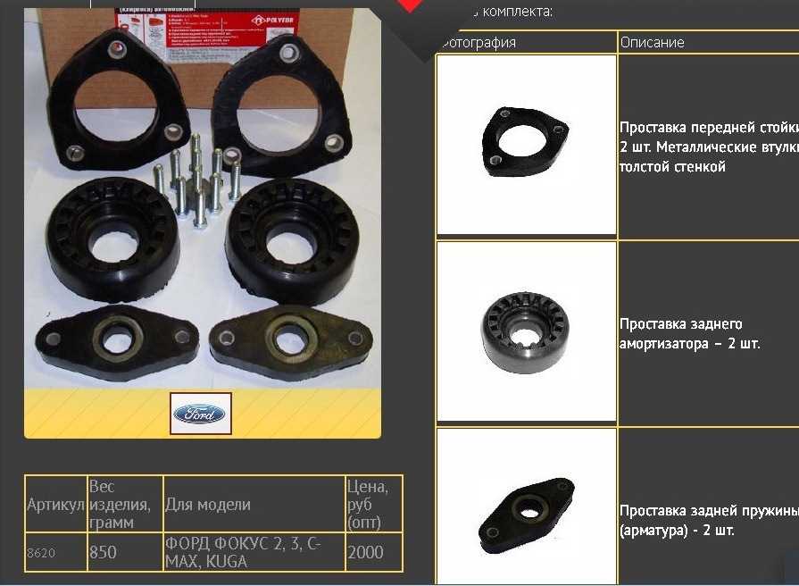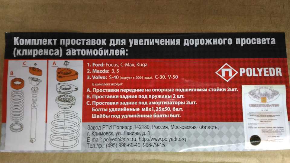 Сегодня в продаже можно найти множество вариантов проставок, отличающихся по производителю, толщине и применяемому материалу. Но на форумах с обсуждением Форд Фокус 2 хвалят изделия РТИ Полиэдр, имеющие доступную цену и неплохие характеристики.