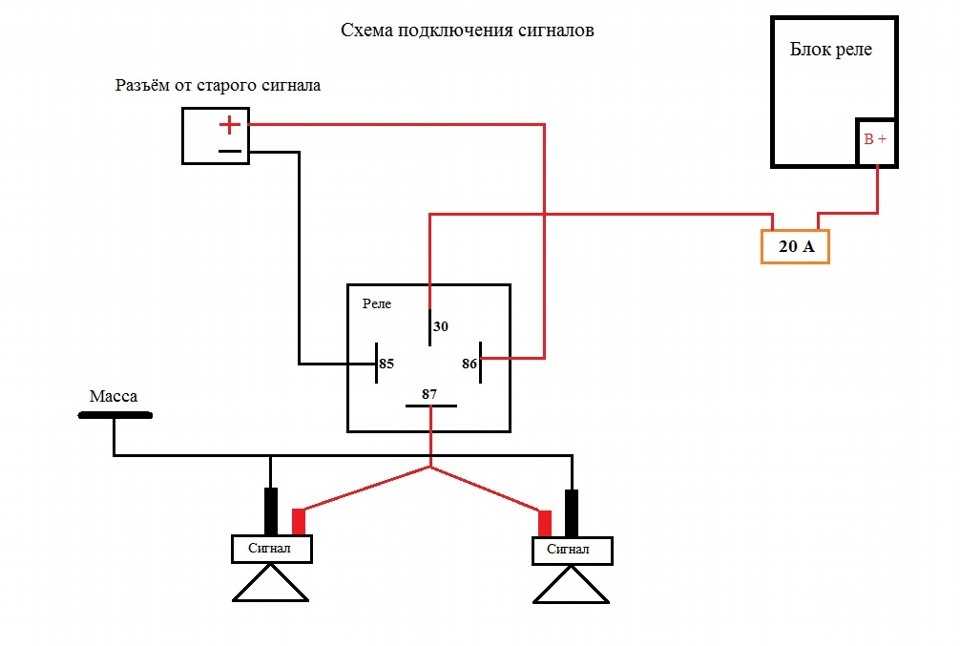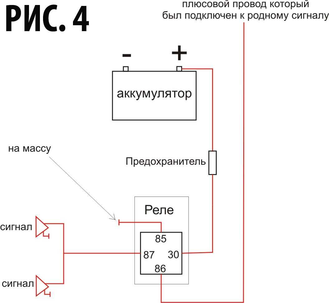 Данная схема подразумевает наличие реле включения сигнала. Такое реле есть на всех современных автомобилях. На отдельной категории автомобилей (например, вазовской классике), реле нет. В этом случае сигнал подключается непосредственно через кнопку на руле.