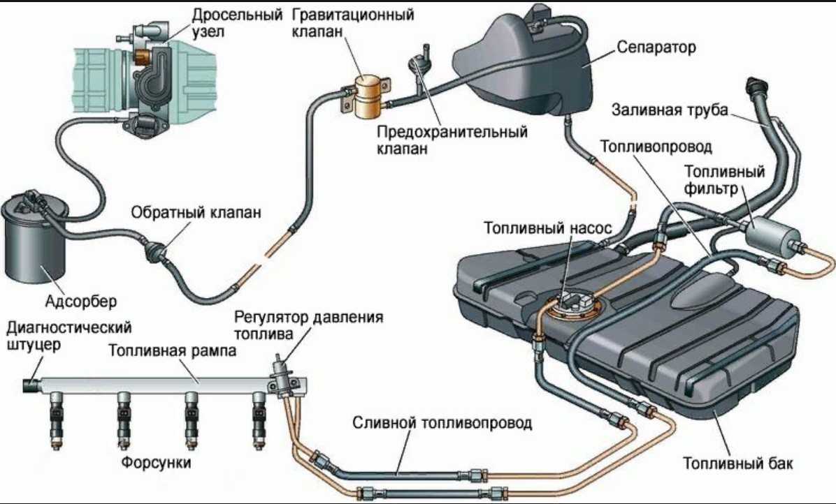 Бензобак автомобиля расположен под задним сиденьем либо под полом багажного отделения. На большинстве современных машин с распределенным впрыском топлива бензонасос установлен непосредственно в баке. Он подает давление в магистраль, ведущую к топливной рампе и форсункам через регулятор давления. Вторая ветка ведет излишки бензина из рампы обратно в бак.