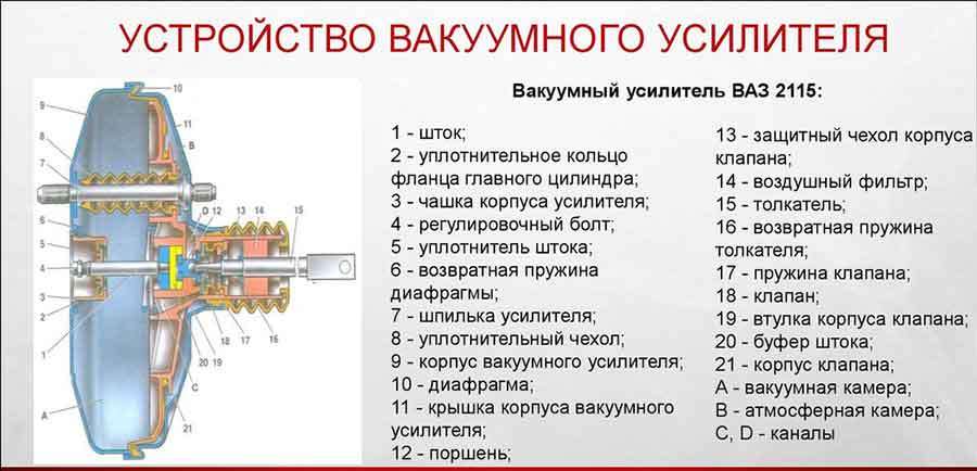 Вакуумный усилитель тормозов (сокращенно — ВУТ) служит для облегчения усилия, которое водитель создает, нажимая на педаль тормоза. Он расположен между главным тормозным цилиндром и упомянутой педалью. Его работа связана со впускным коллектором, с которым он связан вакуумным шлангом. Его работу рассмотрим позже. В конструкцию ВУТ, помимо других элементов, также входит мембрана. Если она повреждена или работает некорректно — это может послужить одной из причин почему глохнет при торможении.