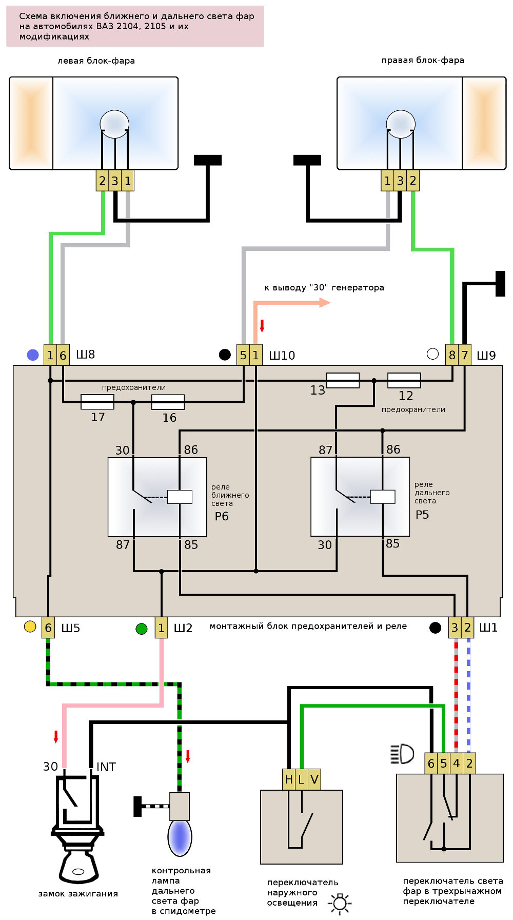 Схема подключения ближнего и дальнего света фар автомобилей ВАЗ 2104 и 2105